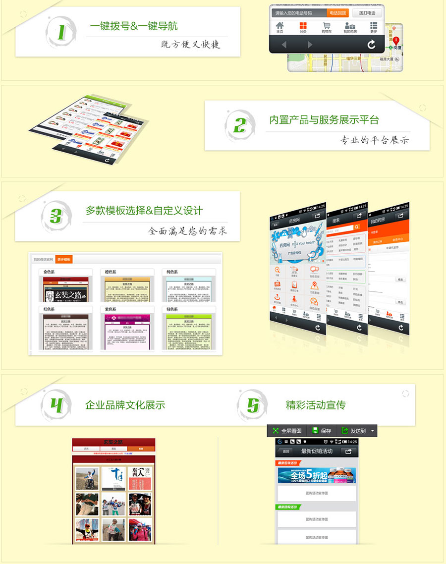 打造微信上的企业官网,让微信不仅仅是聊天工具,全面展示你的产品、服务、理念、文化,让顾客随时了解你的最新资讯动态 ,为您定制企业专属微官网,各类信息方式任你设置,文字,图片,视频,活动,报名!